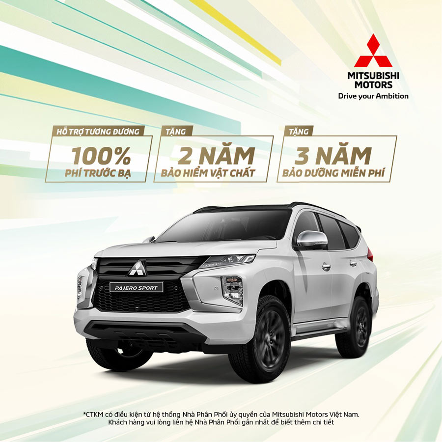 Khách hàng mua xe Pajero Sport sẽ được hưởng ưu đãi hấp dẫn với 100% lệ phí trước bạ, hai năm bảo hiểm vật chất và gói bảo dưỡng miễn phí kéo dài ba năm (hoặc 60.000 km).