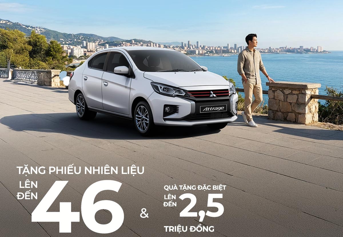 Mitsubishi Attrage, mẫu sedan hạng B tiết kiệm nhiên liệu và là lựa chọn kinh tế phổ biến, được hưởng ưu đãi kép bao gồm phiếu nhiên liệu cùng phụ kiện tặng kèm: